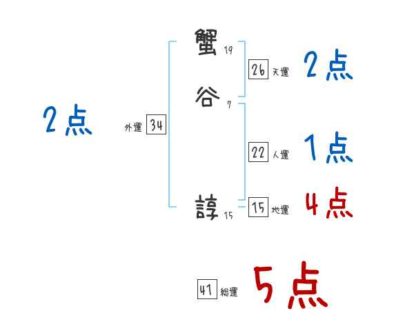 人運![]() | 蟹谷諄さんの人運は22画の1つ星!努力することが苦手ないっぽう手先が器用。芸術性にも優れる。 性格や才能などを表す2番目に重要な運勢です。人間関係や協調性、社会的な成功に影響します。主に20歳から50歳ぐらいまでの中年期の運勢を表します。 |