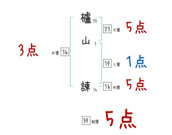 天運![]() | 櫨山諌さんの天運は23画の5つ星!想像力に優れ活力がある。一代で成功し名誉を手に入れる。 家系が持つ宿命的な運勢を表します。祖先から受け継いだ苗字ですので自分の力が及びません。家柄を象徴します。 |
