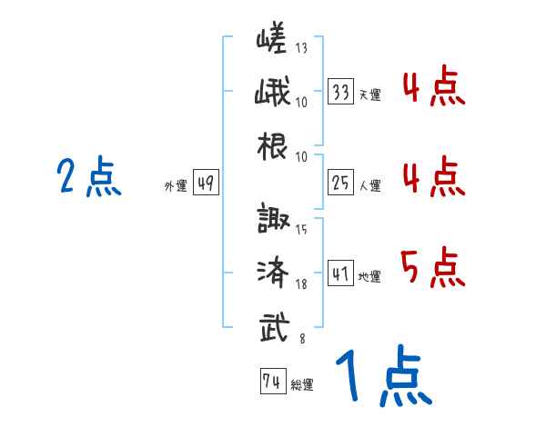 総運![]() | 嵯峨根諏済武さんの総運は74画の1つ星!無気力で怠惰な生活送りがち。規則正しい生活を送るよう気をつけましょう。 あなたの人生を表す1番重要な運勢です。生涯を通じて影響する総合運となり、主に50歳以降の晩年期に影響を及ぼします。 |