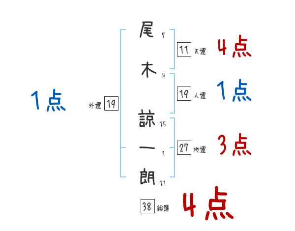 天運![]() | 尾木諒一朗さんの天運は11画の4つ星!着実に富や地位を得る幸運な人生。 家系が持つ宿命的な運勢を表します。祖先から受け継いだ苗字ですので自分の力が及びません。家柄を象徴します。 |
