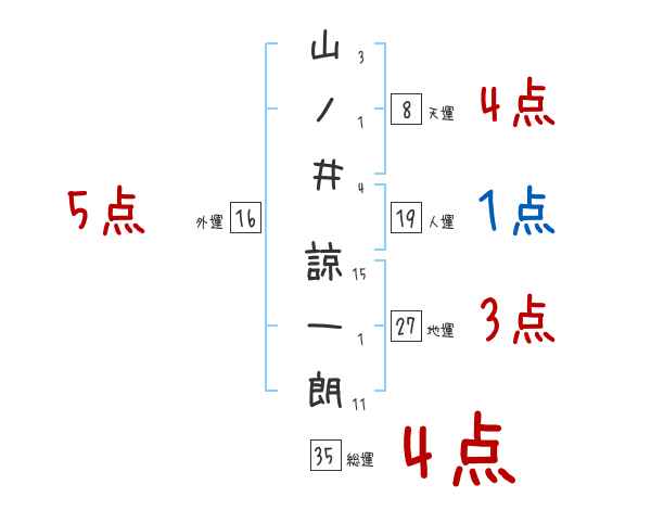 外運![]() | 山ノ井諒一朗さんの外運は16画の5つ星!人望が厚く大きく発展する。逆転成功が見える。 生活面を象徴する運勢です。外部から受ける影響力を表し、結婚運、家庭運や職場、環境への順応性を表します。 |