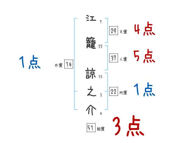 外運![]() | 江籠諒之介さんの外運は14画の1つ星!人に対して優しいがストレスを溜め込みがち。人間関係のトラブルを避けるよう気をつけましょう。 生活面を象徴する運勢です。外部から受ける影響力を表し、結婚運、家庭運や職場、環境への順応性を表します。 |
