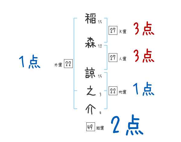 総運![]() | 稲森諒之介さんの総運は49画の2つ星!不安定な性格で明暗がある人生。周りの人には支援されやすい。 あなたの人生を表す1番重要な運勢です。生涯を通じて影響する総合運となり、主に50歳以降の晩年期に影響を及ぼします。 |