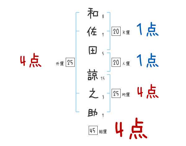 総運![]() | 和佐田諒之助さんの総運は45画の4つ星!もくもくと物事を進め達成する。地味な努力家。 あなたの人生を表す1番重要な運勢です。生涯を通じて影響する総合運となり、主に50歳以降の晩年期に影響を及ぼします。 |