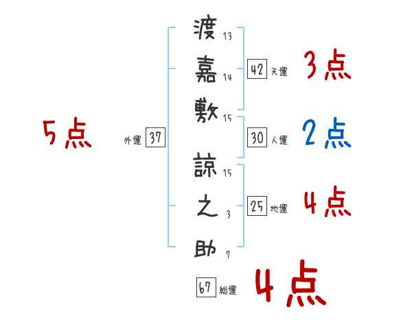 外運![]() | 渡嘉敷諒之助さんの外運は37画の5つ星!努力家で順応性に優れる。現実的な考え方ができ忠実に物事をこなす。 生活面を象徴する運勢です。外部から受ける影響力を表し、結婚運、家庭運や職場、環境への順応性を表します。 |