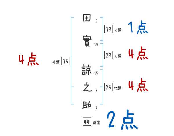 総運![]() | 田實諒之助さんの総運は44画の2つ星!誠実で慎重な性格。物事を考えすぎないように注意しましょう。 あなたの人生を表す1番重要な運勢です。生涯を通じて影響する総合運となり、主に50歳以降の晩年期に影響を及ぼします。 |