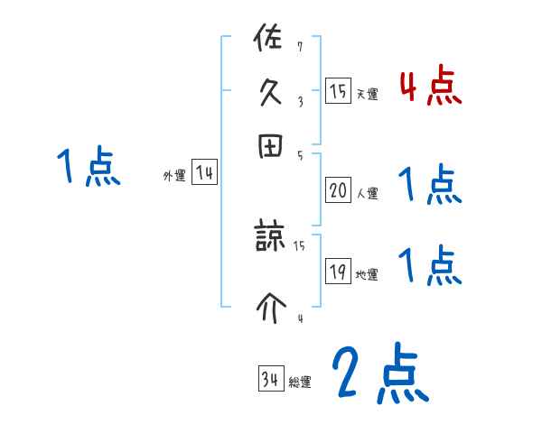 | 総運  | 佐久田諒介さんの総運は34画の2つ星!独創性に優れるが、自尊心が強く災難に注意しましょう。あなたの人生を表す1番重要な運勢です。生涯を通じて影響する総合運となり、主に50歳以降の晩年期に影響を及ぼします。 |