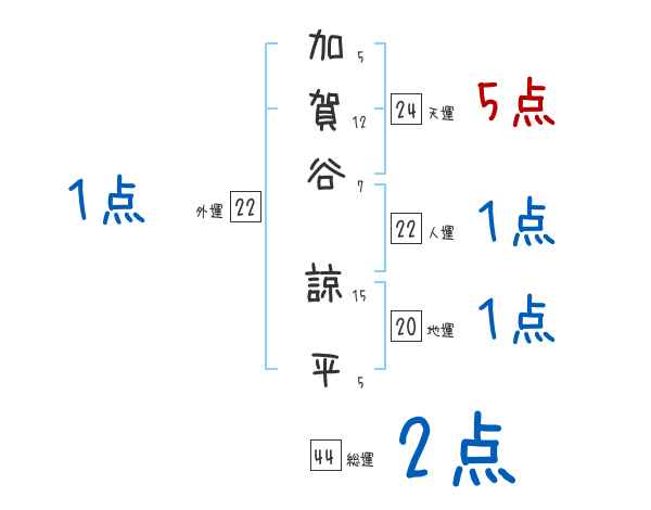 天運![]() | 加賀谷諒平さんの天運は24画の5つ星!家庭運が良く順調な人生。金運にも恵まれる。 家系が持つ宿命的な運勢を表します。祖先から受け継いだ苗字ですので自分の力が及びません。家柄を象徴します。 |