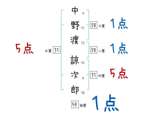 総運![]() | 中野渡諒次郎さんの総運は59画の1つ星!意志の弱さであきらめることが多いかも。粘り強さが必要。 あなたの人生を表す1番重要な運勢です。生涯を通じて影響する総合運となり、主に50歳以降の晩年期に影響を及ぼします。 |