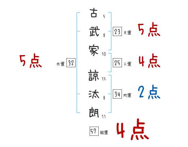 外運![]() | 古武家諒汰朗さんの外運は32画の5つ星!柔軟性があり成功する。チャンスが多く金運が良い。 生活面を象徴する運勢です。外部から受ける影響力を表し、結婚運、家庭運や職場、環境への順応性を表します。 |
