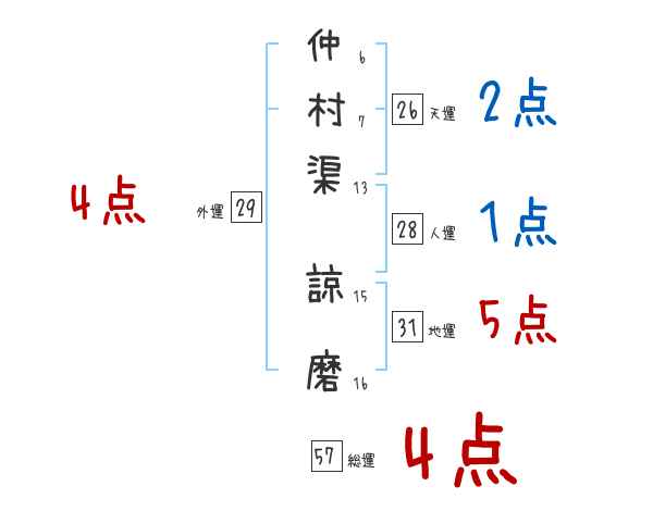 天運![]() | 仲村渠諒磨さんの天運は26画の2つ星!波瀾万丈かも。信頼できる人を大事にしましょう。 家系が持つ宿命的な運勢を表します。祖先から受け継いだ苗字ですので自分の力が及びません。家柄を象徴します。 |
