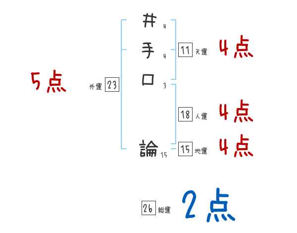 天運![]() | 井手口論さんの天運は11画の4つ星!着実に富や地位を得る幸運な人生。 家系が持つ宿命的な運勢を表します。祖先から受け継いだ苗字ですので自分の力が及びません。家柄を象徴します。 |