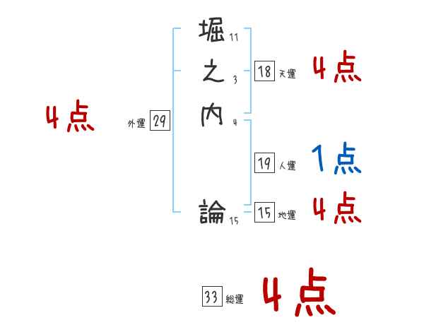 地運![]() | 堀之内論さんの地運は15画の4つ星!人徳があり出世する。順調に物事を進め円満な人生。 個性を表す基礎的な運勢です。性格形成や対人関係、行動力など家庭環境に影響されます。主に誕生してから20歳くらいまでの若年期の運勢を表します。 |
