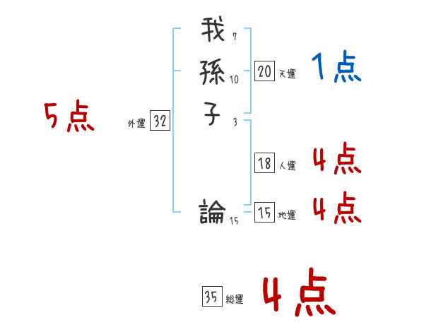 外運![]() | 我孫子論さんの外運は32画の5つ星!柔軟性があり成功する。チャンスが多く金運が良い。 生活面を象徴する運勢です。外部から受ける影響力を表し、結婚運、家庭運や職場、環境への順応性を表します。 |