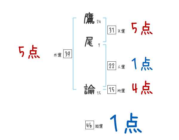 外運![]() | 鷹尾論さんの外運は39画の5つ星!社交性に優れ人望が厚い。人の上に立ち成功する。 生活面を象徴する運勢です。外部から受ける影響力を表し、結婚運、家庭運や職場、環境への順応性を表します。 |
