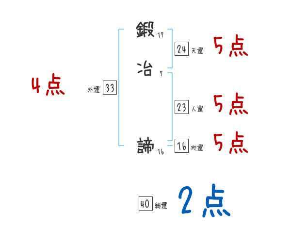 人運![]() | 鍛冶諦さんの人運は23画の5つ星!想像力に優れ活力がある。一代で成功し名誉を手に入れる。 性格や才能などを表す2番目に重要な運勢です。人間関係や協調性、社会的な成功に影響します。主に20歳から50歳ぐらいまでの中年期の運勢を表します。 |