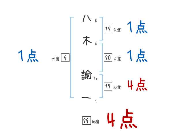 外運![]() | 八木諭一さんの外運は9画の1つ星!消極的で才能を発揮することが苦手なことも。周りの意見に耳を傾けましょう。 生活面を象徴する運勢です。外部から受ける影響力を表し、結婚運、家庭運や職場、環境への順応性を表します。 |