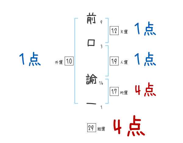 外運![]() | 前口諭一さんの外運は10画の1つ星!不安を感じやすい傾向。ストレスを抱えないように注意しましょう。 生活面を象徴する運勢です。外部から受ける影響力を表し、結婚運、家庭運や職場、環境への順応性を表します。 |