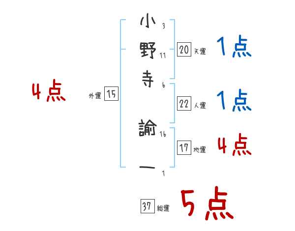 人運![]() | 小野寺諭一さんの人運は22画の1つ星!努力することが苦手ないっぽう手先が器用。芸術性にも優れる。 性格や才能などを表す2番目に重要な運勢です。人間関係や協調性、社会的な成功に影響します。主に20歳から50歳ぐらいまでの中年期の運勢を表します。 |