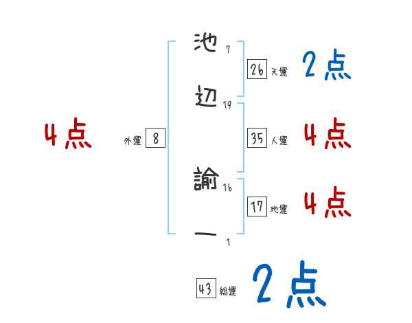総運![]() | 池辺諭一さんの総運は43画の2つ星!頑固な性格で独立心が強いかも。やや非現実的で浪費に注意しましょう。 あなたの人生を表す1番重要な運勢です。生涯を通じて影響する総合運となり、主に50歳以降の晩年期に影響を及ぼします。 |