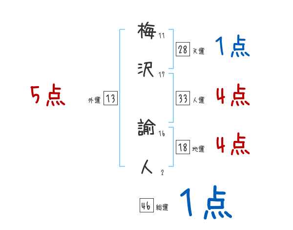 天運![]() | 梅沢諭人さんの天運は28画の1つ星!家庭環境に注意。スポーツで活躍できる能力があるかも。 家系が持つ宿命的な運勢を表します。祖先から受け継いだ苗字ですので自分の力が及びません。家柄を象徴します。 |