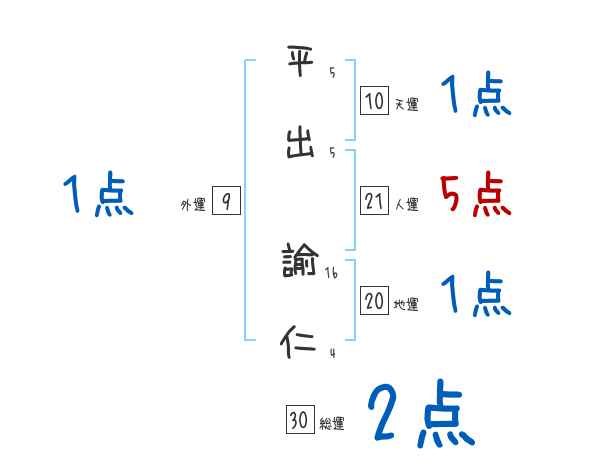 人運![]() | 平出諭仁さんの人運は21画の5つ星!統率力がある。独立し成功する。名誉を手に入れる。 性格や才能などを表す2番目に重要な運勢です。人間関係や協調性、社会的な成功に影響します。主に20歳から50歳ぐらいまでの中年期の運勢を表します。 |
