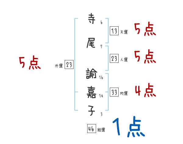 外運![]() | 寺尾諭嘉子さんの外運は23画の5つ星!想像力に優れ活力がある。一代で成功し名誉を手に入れる。 生活面を象徴する運勢です。外部から受ける影響力を表し、結婚運、家庭運や職場、環境への順応性を表します。 |