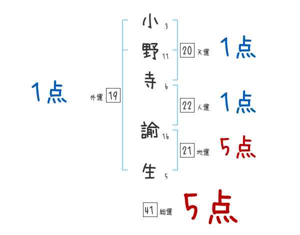 外運![]() | 小野寺諭生さんの外運は19画の1つ星!優れた才能を持ちますが、協調性が足りないことも。周りの人と協力する事を意識しましょう。 生活面を象徴する運勢です。外部から受ける影響力を表し、結婚運、家庭運や職場、環境への順応性を表します。 |