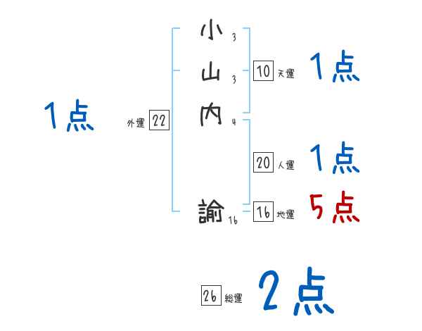 外運![]() | 小山内諭さんの外運は22画の1つ星!努力することが苦手ないっぽう手先が器用。芸術性にも優れる。 生活面を象徴する運勢です。外部から受ける影響力を表し、結婚運、家庭運や職場、環境への順応性を表します。 |