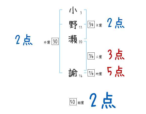 総運![]() | 小野瀬諭さんの総運は50画の2つ星!浮き沈みが激しく不安定。しりすぼみに衰退しやすいので注意しましょう。 あなたの人生を表す1番重要な運勢です。生涯を通じて影響する総合運となり、主に50歳以降の晩年期に影響を及ぼします。 |