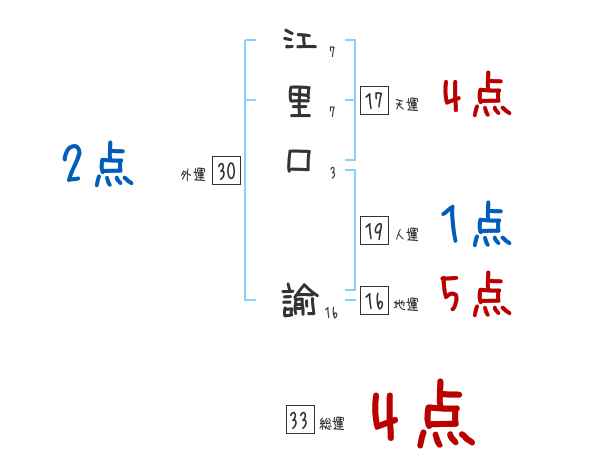 外運![]() | 江里口諭さんの外運は30画の2つ星!浮き沈みの激しさに注意しましょう。 生活面を象徴する運勢です。外部から受ける影響力を表し、結婚運、家庭運や職場、環境への順応性を表します。 |