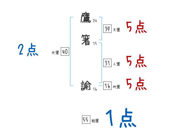 天運![]() | 鷹箸諭さんの天運は39画の5つ星!社交性に優れ人望が厚い。人の上に立ち成功する。 家系が持つ宿命的な運勢を表します。祖先から受け継いだ苗字ですので自分の力が及びません。家柄を象徴します。 |