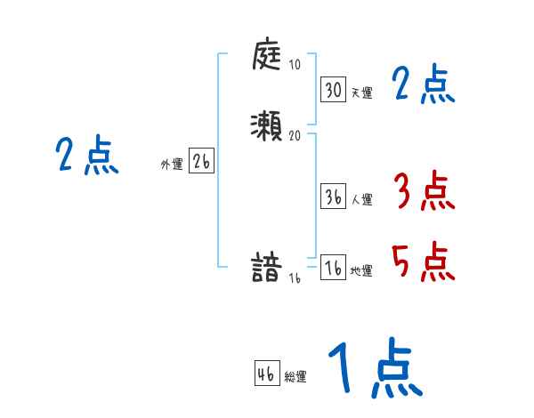 天運![]() | 庭瀬諳さんの天運は30画の2つ星!浮き沈みの激しさに注意しましょう。 家系が持つ宿命的な運勢を表します。祖先から受け継いだ苗字ですので自分の力が及びません。家柄を象徴します。 |