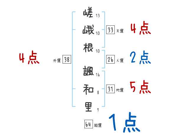 天運![]() | 嵯峨根諷和里さんの天運は33画の4つ星!権力志向でプライドが高い。勇気があり運を切り開き成功する。 家系が持つ宿命的な運勢を表します。祖先から受け継いだ苗字ですので自分の力が及びません。家柄を象徴します。 |