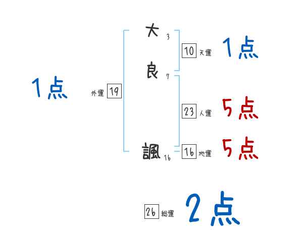 人運![]() | 大良諷さんの人運は23画の5つ星!想像力に優れ活力がある。一代で成功し名誉を手に入れる。 性格や才能などを表す2番目に重要な運勢です。人間関係や協調性、社会的な成功に影響します。主に20歳から50歳ぐらいまでの中年期の運勢を表します。 |
