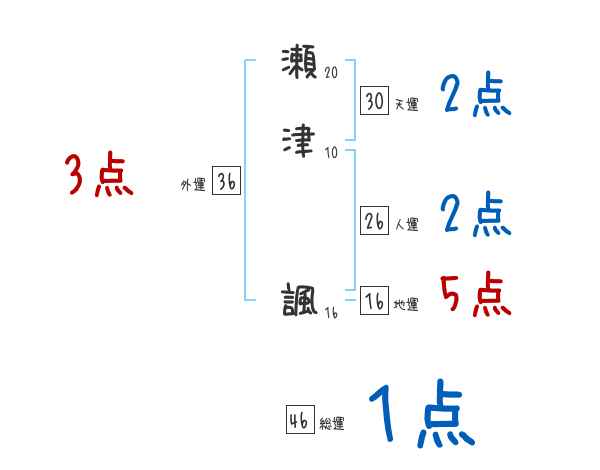 天運![]() | 瀬津諷さんの天運は30画の2つ星!浮き沈みの激しさに注意しましょう。 家系が持つ宿命的な運勢を表します。祖先から受け継いだ苗字ですので自分の力が及びません。家柄を象徴します。 |