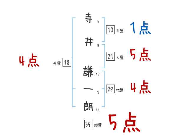 人運![]() | 寺井謙一朗さんの人運は21画の5つ星!統率力がある。独立し成功する。名誉を手に入れる。 性格や才能などを表す2番目に重要な運勢です。人間関係や協調性、社会的な成功に影響します。主に20歳から50歳ぐらいまでの中年期の運勢を表します。 |
