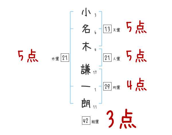外運![]() | 小名木謙一朗さんの外運は21画の5つ星!統率力がある。独立し成功する。名誉を手に入れる。 生活面を象徴する運勢です。外部から受ける影響力を表し、結婚運、家庭運や職場、環境への順応性を表します。 |