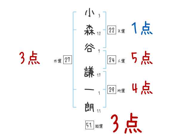 総運![]() | 小森谷謙一朗さんの総運は51画の3つ星!変化が激しく、危険に注意。堅実な性格。 あなたの人生を表す1番重要な運勢です。生涯を通じて影響する総合運となり、主に50歳以降の晩年期に影響を及ぼします。 |