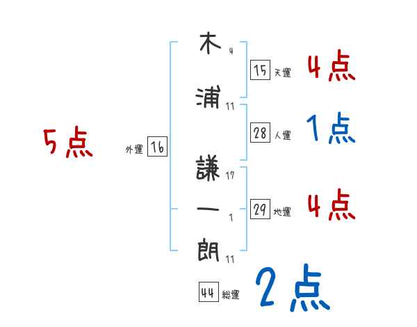 総運![]() | 木浦謙一朗さんの総運は44画の2つ星!誠実で慎重な性格。物事を考えすぎないように注意しましょう。 あなたの人生を表す1番重要な運勢です。生涯を通じて影響する総合運となり、主に50歳以降の晩年期に影響を及ぼします。 |