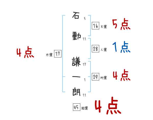 外運![]() | 石動謙一朗さんの外運は17画の4つ星!積極的な行動力。地位を気づき財産を手に入れる。純粋な心と直感力。 生活面を象徴する運勢です。外部から受ける影響力を表し、結婚運、家庭運や職場、環境への順応性を表します。 |