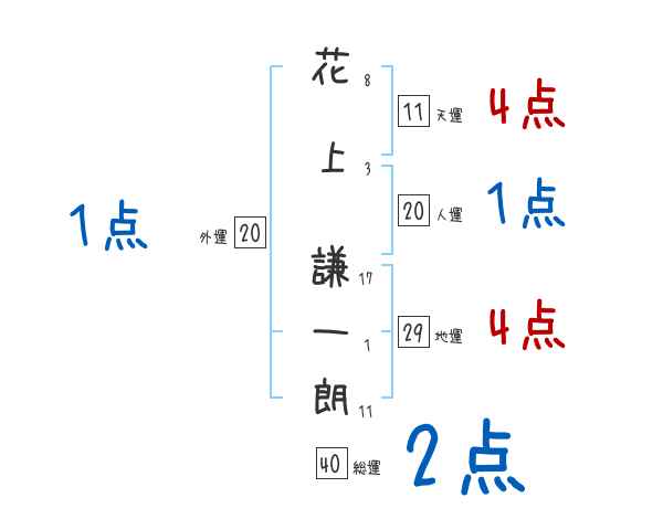 天運![]() | 花上謙一朗さんの天運は11画の4つ星!着実に富や地位を得る幸運な人生。 家系が持つ宿命的な運勢を表します。祖先から受け継いだ苗字ですので自分の力が及びません。家柄を象徴します。 |