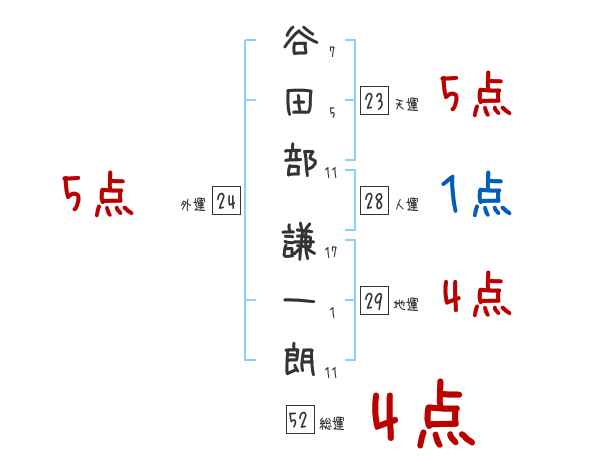 天運![]() | 谷田部謙一朗さんの天運は23画の5つ星!想像力に優れ活力がある。一代で成功し名誉を手に入れる。 家系が持つ宿命的な運勢を表します。祖先から受け継いだ苗字ですので自分の力が及びません。家柄を象徴します。 |