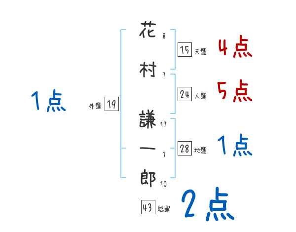 地運![]() | 花村謙一郎さんの地運は28画の1つ星!家庭環境に注意。スポーツで活躍できる能力があるかも。 個性を表す基礎的な運勢です。性格形成や対人関係、行動力など家庭環境に影響されます。主に誕生してから20歳くらいまでの若年期の運勢を表します。 |