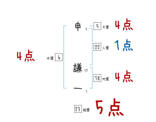 天運![]() | 申謙一さんの天運は5画の4つ星!健康で安泰。協調性に優れ、財産に恵まれる。 家系が持つ宿命的な運勢を表します。祖先から受け継いだ苗字ですので自分の力が及びません。家柄を象徴します。 |