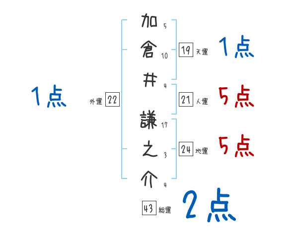 総運![]() | 加倉井謙之介さんの総運は43画の2つ星!頑固な性格で独立心が強いかも。やや非現実的で浪費に注意しましょう。 あなたの人生を表す1番重要な運勢です。生涯を通じて影響する総合運となり、主に50歳以降の晩年期に影響を及ぼします。 |