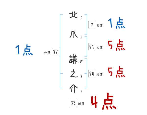 天運![]() | 北爪謙之介さんの天運は9画の1つ星!消極的で才能を発揮することが苦手なことも。周りの意見に耳を傾けましょう。 家系が持つ宿命的な運勢を表します。祖先から受け継いだ苗字ですので自分の力が及びません。家柄を象徴します。 |