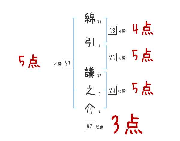 総運![]() | 綿引謙之介さんの総運は42画の3つ星!病気に注意。多芸であるが消極的でおとなしい。 あなたの人生を表す1番重要な運勢です。生涯を通じて影響する総合運となり、主に50歳以降の晩年期に影響を及ぼします。 |