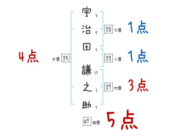 総運![]() | 宇治田謙之助さんの総運は47画の5つ星!実力が開花し発展する円満な人生。財に恵まれる。 あなたの人生を表す1番重要な運勢です。生涯を通じて影響する総合運となり、主に50歳以降の晩年期に影響を及ぼします。 |