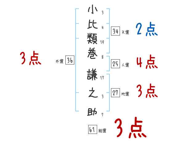外運![]() | 小比類巻謙之助さんの外運は36画の3つ星!先見性が豊かです。多少神経質で苦労することも。 生活面を象徴する運勢です。外部から受ける影響力を表し、結婚運、家庭運や職場、環境への順応性を表します。 |